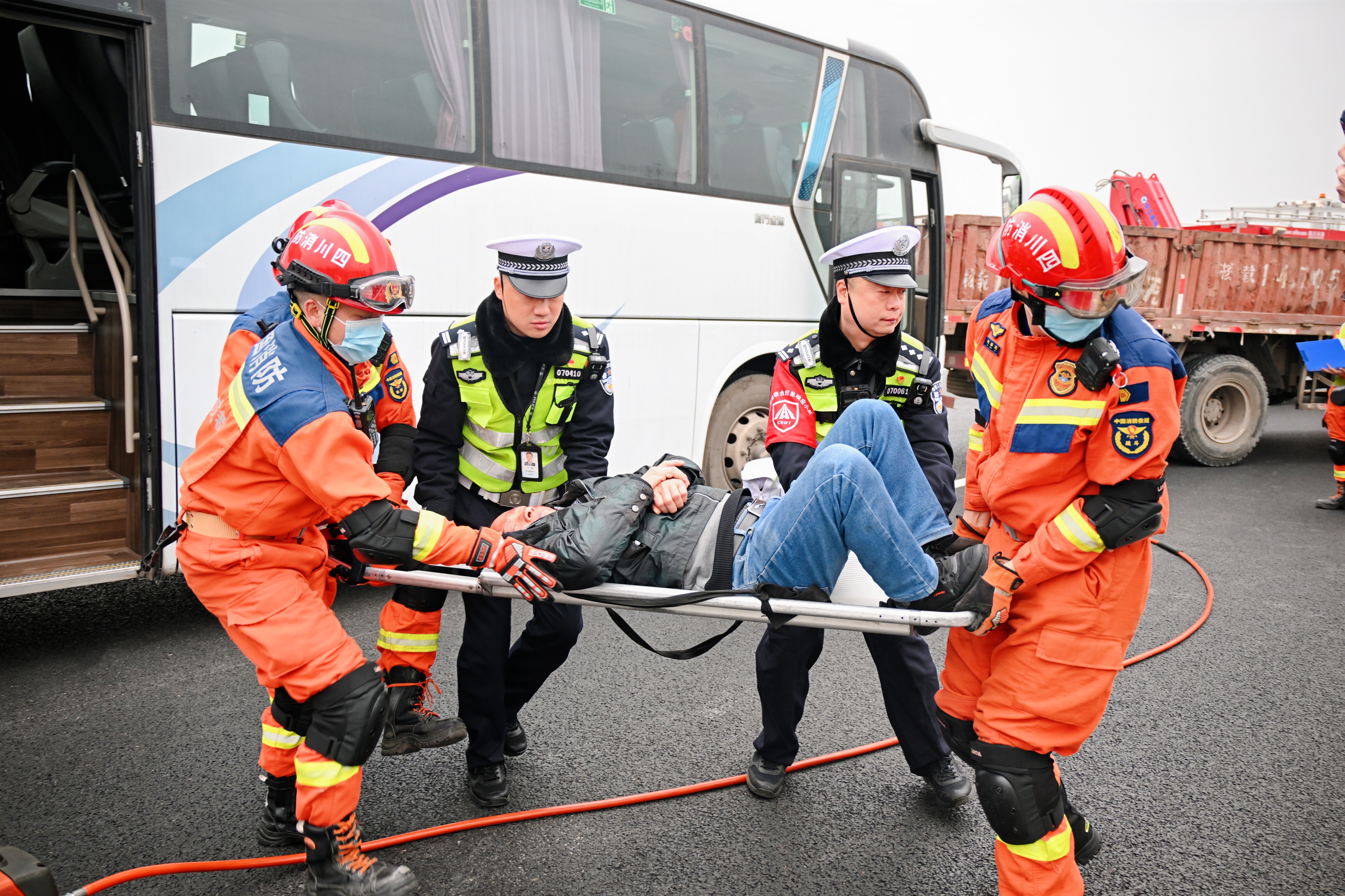 演练模拟春运高峰期间,成南高速发生一起大客车与重型货车追尾碰撞,造成多人受伤、1人被困且伤情严重的交通事故。